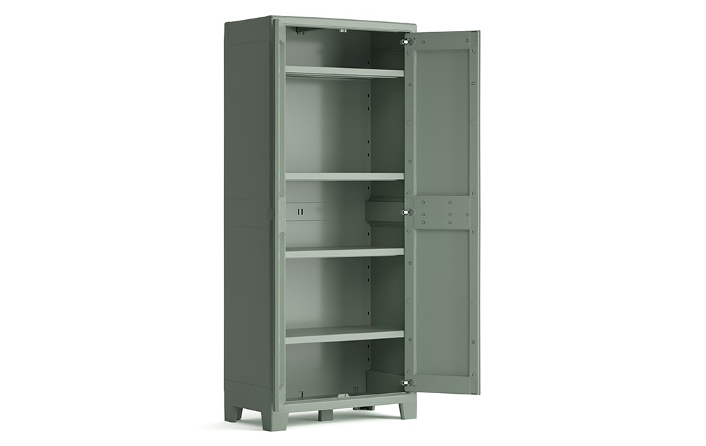 Aggiungi un tocco di stile all'organizzazione dei tuoi spazi. Planet Outdoor Alto combina un design dalle linee morbide con una struttura robusta, resistente all'acqua e ai raggi UV. Dotato di chiusura con predisposizione per il lucchetto, di 4 ripiani regolabili e di una base rinforzata con una portata massima di 30 Kg ciascuno