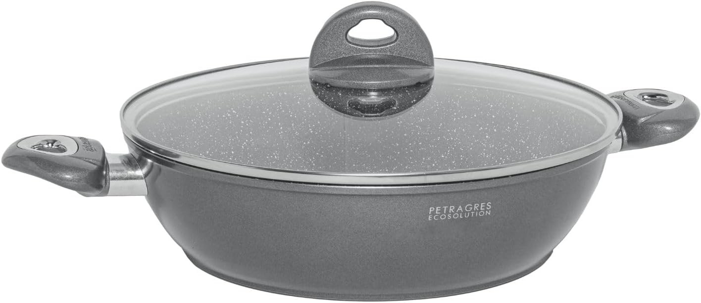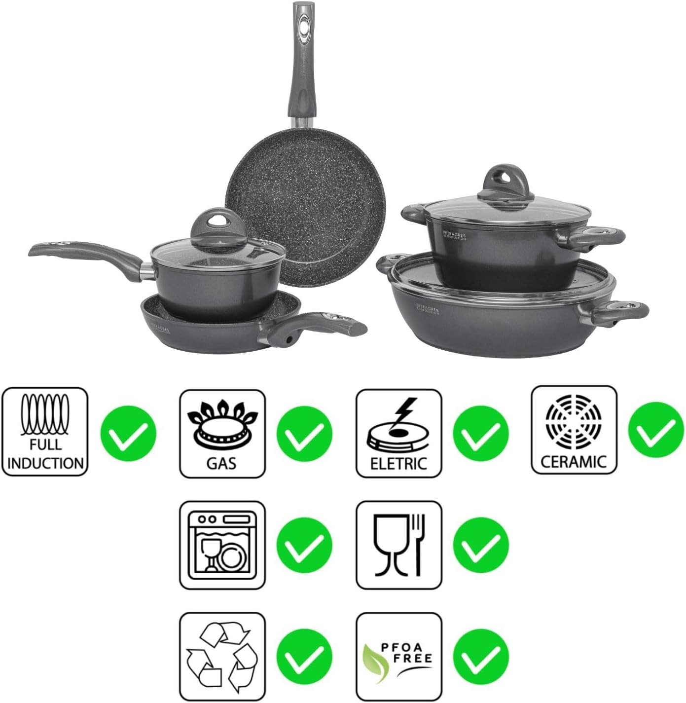 La batteria di pentole Aeternum Petragres Ecosolution da 8 pezzi unisce innovazione, ecosostenibilità e prestazioni professionali in cucina. Il fondo Full Induction ad alto spessore garantisce una distribuzione uniforme del calore su tutti i piani cottura, riducendo tempi ed energia fino al 40%. Il rivestimento antiaderente PFAS FREE, rinforzato con particelle minerali naturali, consente di cucinare in modo sano e facilita la pulizia con un minor utilizzo di acqua.