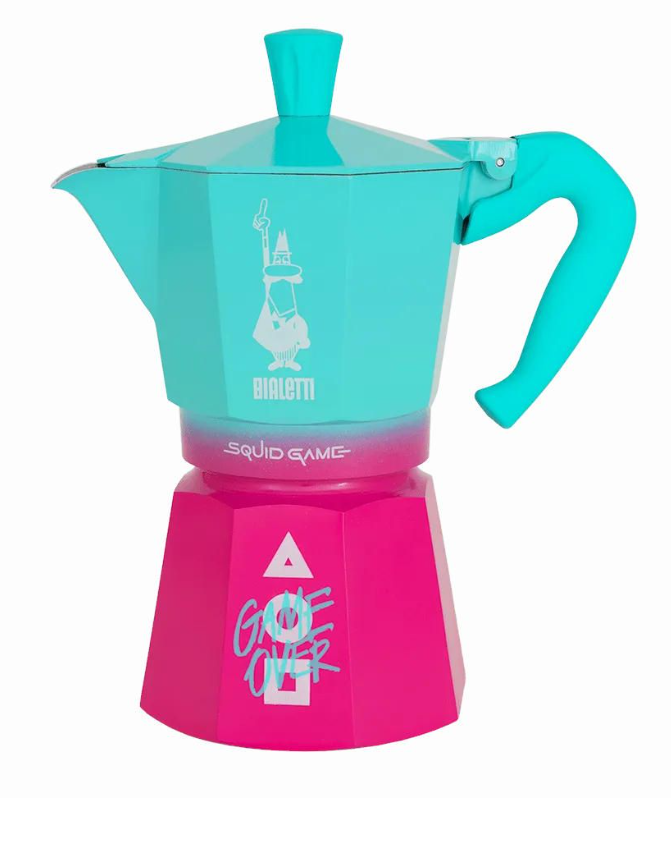 La Bialetti Moka Express Squid Game da 6 tazze unisce la tradizione del caffè italiano all’iconico mondo della serie Netflix. Realizzata in alluminio con manico antiscottatura, garantisce sicurezza e praticità. I colori vivaci, i dettagli geometrici e la scritta "Game Over" rendono questa caffettiera un pezzo da collezione unico. Non lavabile in lavastoviglie e compatibile con fornelli a gas; per l’uso su piastra a induzione è necessario il piattello Bialetti.