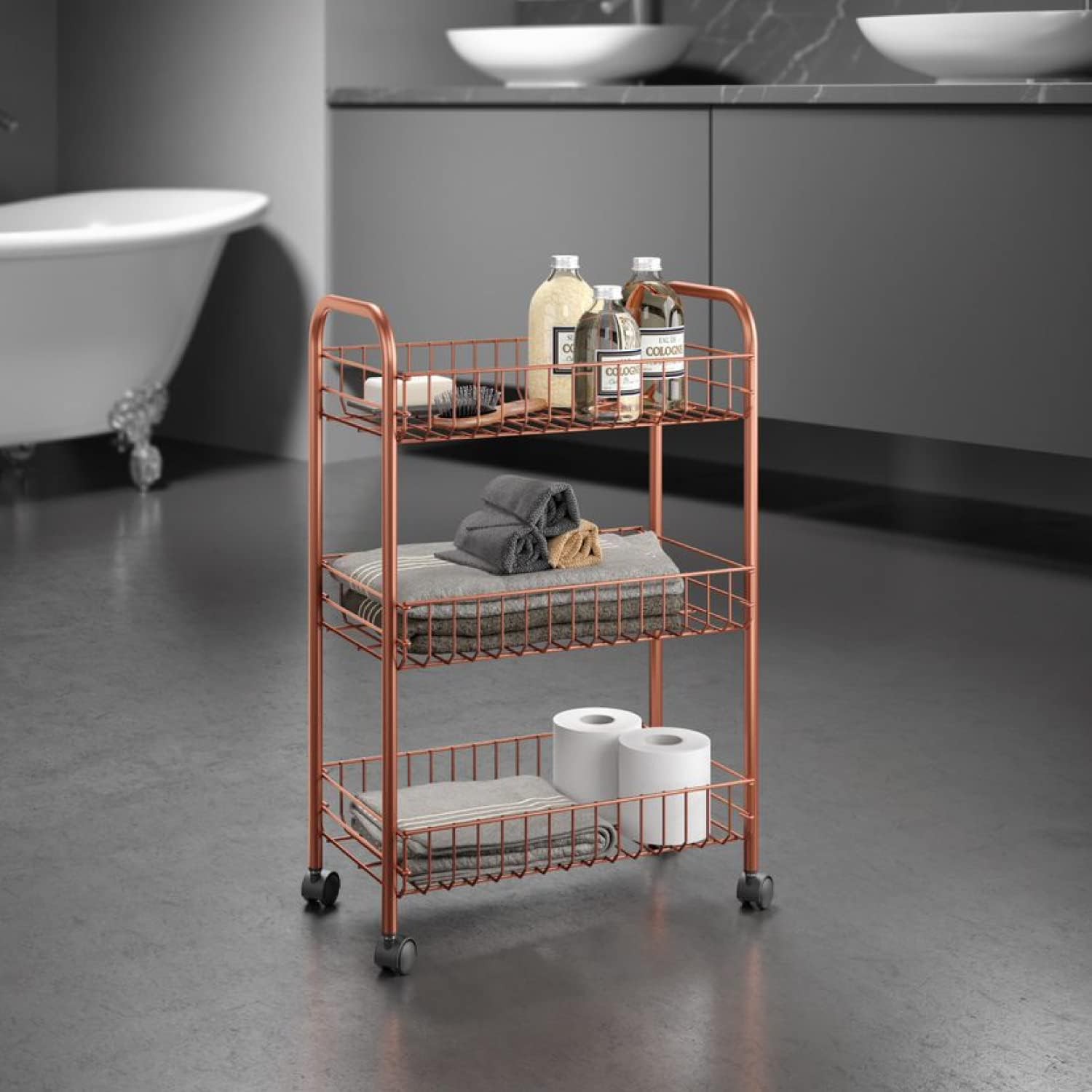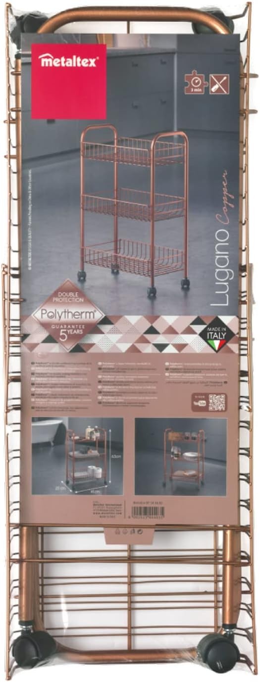 Lo scaffaletto Metaltex Lugano Copper è un pratico carrello a 3 piani con ruote piroettanti, perfetto per organizzare e spostare oggetti in casa o in ufficio. Realizzato con materiali resistenti e dal rivestimento antistatico, è durevole e protetto dalla ruggine. Il design elegante con finitura copper aggiunge un tocco moderno e raffinato a qualsiasi ambiente.