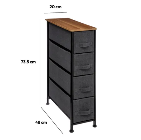 Il mobile a 4 cassetti in tessuto grigio antracite 5five è la soluzione ideale per chi cerca un organizer salvaspazio con un tocco moderno. Grazie alle sue dimensioni compatte (48x20x77 cm), si adatta facilmente a qualsiasi ambiente, dalla camera da letto all'ufficio. La struttura solida e i cassetti in tessuto offrono un’ottima capacità di archiviazione per riporre vestiti, accessori o documenti. Perfetto per chi desidera un mobile funzionale, elegante e facile da montare.