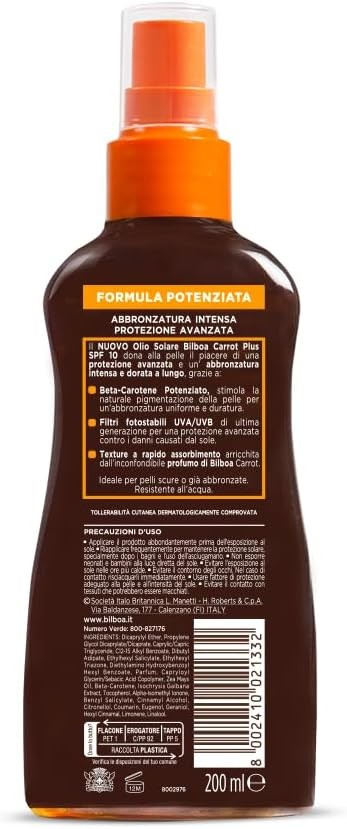 Bilboa Carrot Plus, Olio Solare Spray SPF 10, Olio Abbronzante Corpo - 200 ml