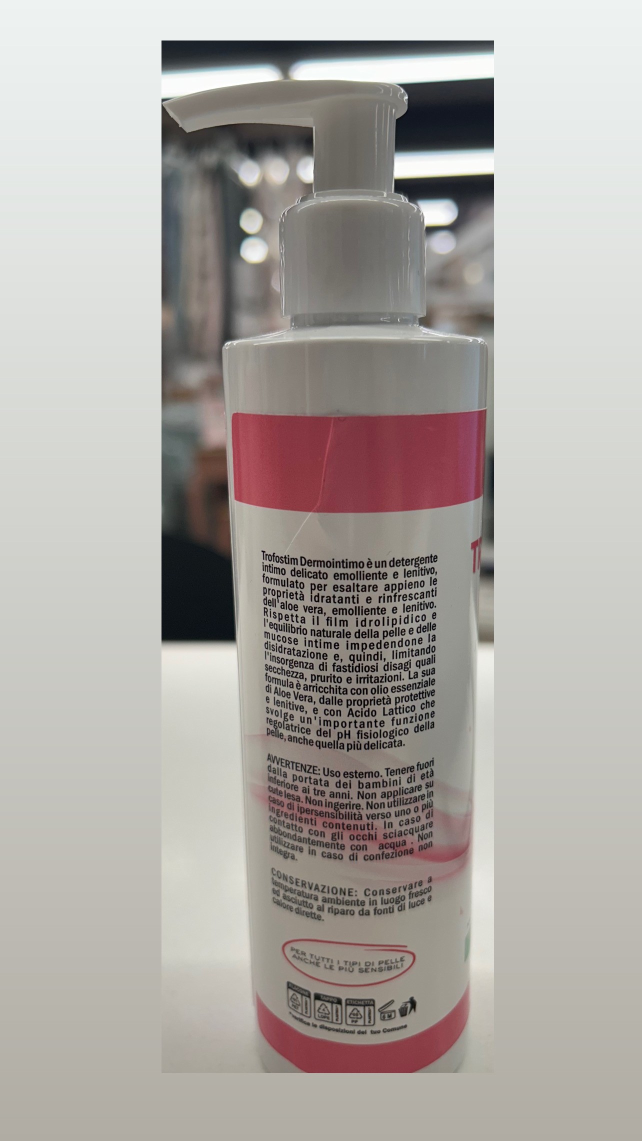 Trofostim Dermointimo è un detergente intimo delicato formulato per offrire un’azione emolliente, lenitiva e rinfrescante grazie alle proprietà naturali dell’aloe vera. La sua formula, arricchita con olio essenziale di aloe vera e acido lattico, aiuta a preservare il naturale equilibrio della pelle e delle mucose intime, rispettando il film idrolipidico. Ideale per contrastare secchezza, prurito e irritazioni, garantisce una sensazione di comfort e freschezza quotidiana.