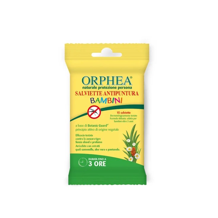 Le salviettine antipuntura Orphea Bambini sono la soluzione ideale per proteggere la pelle delicata dei bambini oltre 3 anni dalle punture di zanzare, inclusa la zanzara tigre. La formula delicata, a base di Citriodiol, è priva di alcool e profumo, ed è arricchita con estratti di Camomilla, Pantenolo e Aloe Vera per un’azione lenitiva e idratante. Efficaci fino a 3 ore, queste salviettine sono dermatologicamente testate e adatte alla pelle sensibile dei bambini. Confezionate in pratico formato da 15 pezzi, sono facili da portare sempre con sé.