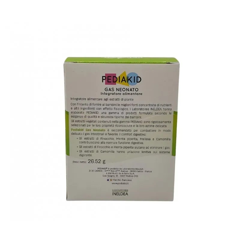 Pediakid Gas Neonato è un integratore alimentare naturale pensato per alleviare il gonfiore addominale e le coliche nei neonati. Contiene una miscela di estratti vegetali, tra cui finocchio, tiglio, camomilla, menta e melissa, noti per favorire il comfort digestivo e ridurre i gas intestinali in modo delicato. Senza coloranti, conservanti o allergeni, è ideale per un sollievo naturale.