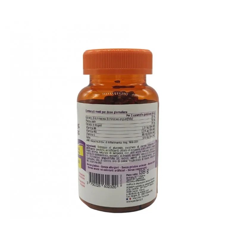 Pediakid Difese Immunitarie è un integratore alimentare in caramelle gommose al gusto lampone, formulato per rafforzare il sistema immunitario dei bambini. Contiene pappa reale, estratto di echinacea, propoli, vitamine e rame, ingredienti selezionati per sostenere le difese naturali e ridurre la stanchezza. Ideale per bambini dai 3 anni in su, senza coloranti artificiali o conservanti.