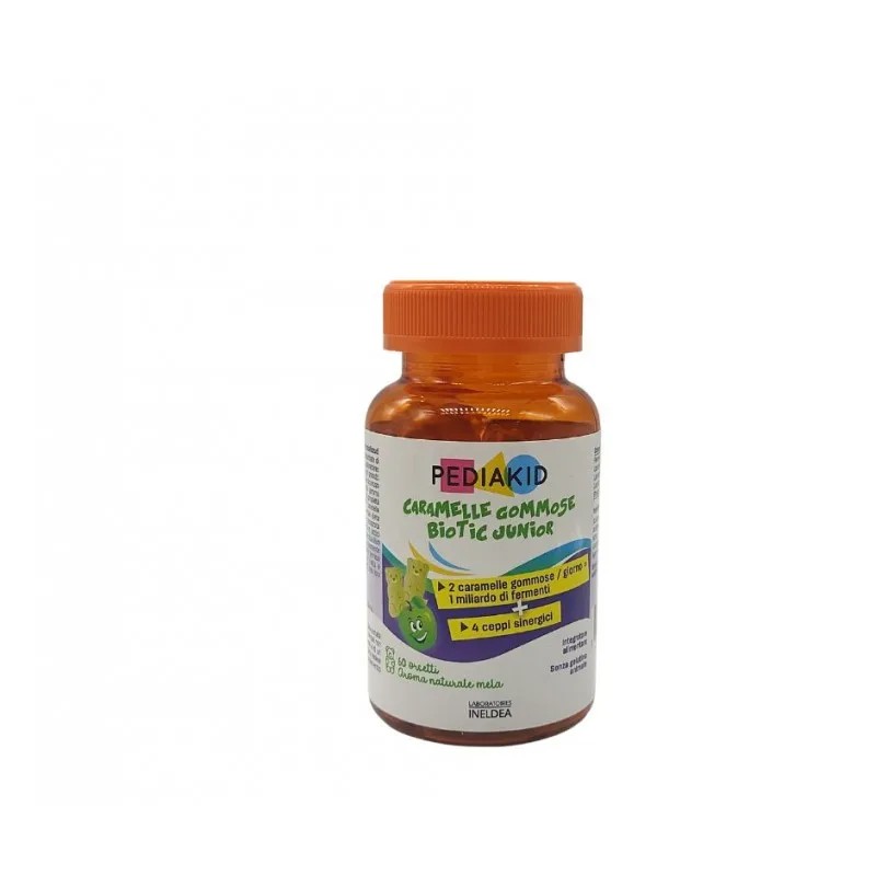 Pediakid Biotic Junior è un integratore alimentare in caramelle gommose al gusto mela, formulato per favorire l’equilibrio della flora intestinale e supportare il sistema immunitario dei bambini. Contiene 5 miliardi di UFC di probiotici per porzione, tra cui Lactobacillus acidophilus e Bifidobacterium lactis, insieme a prebiotici come inulina e frutto-oligosaccaridi. Arricchito con vitamine C, D e B6, è privo di coloranti, conservanti e allergeni, ideale per un uso quotidiano.