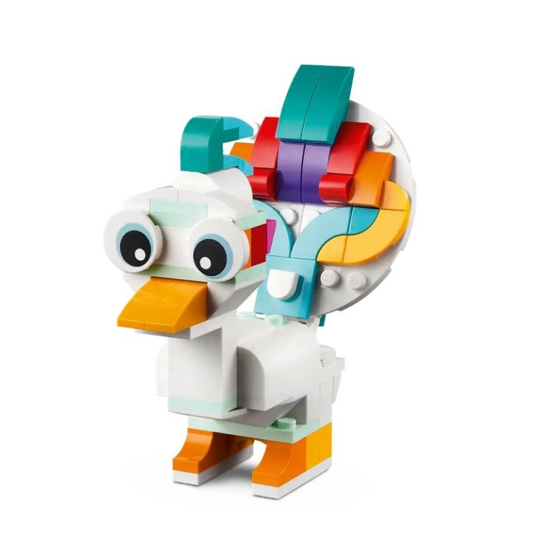 I bambini più fantasiosi, dai 7 anni in su, saranno trasportati in una terra mitica per un’azione avvincente con questo set di costruzione dell’Unicorno magico 3 in 1 (31140). Il set contiene un unicorno giocattolo con un corno dorato, una coda colorata e gambe e zoccoli mobili. Può assumere 2 diverse pose: in piedi sulle 4 zampe o sollevato sulle 2 zampe posteriori ed esposto sul supporto-arcobaleno del set.