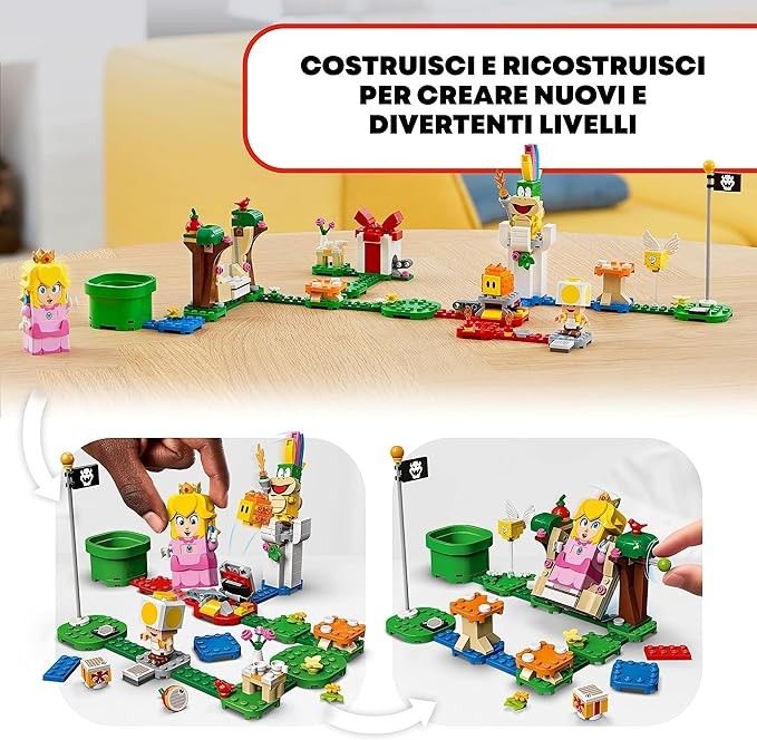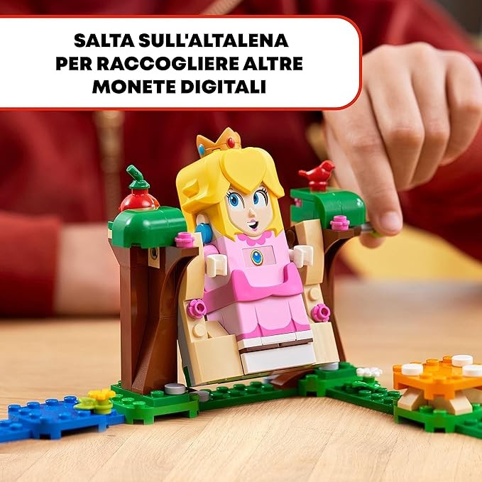 Il set LEGO Super Mario Starter Pack Avventure di Peach 71403 è perfetto per i fan della serie LEGO Super Mario. Include una figura interattiva della Principessa Peach, Lemmy e un Toad Giallo, insieme a un percorso costruibile. La Principessa Peach è dotata di un sensore di colore, uno schermo LCD per visualizzare diverse reazioni al movimento e un altoparlante che riproduce suoni e musiche del videogame. I bambini possono guadagnare monete digitali aiutando Peach a giocare sull'altalena, interagendo con Toad Giallo, e recuperando premi dal blocco ? volante. Il frutto rosso può essere utilizzato per ottenere monete extra o regalato a Toad Giallo. Il set include un tubo di partenza, un'asta della bandiera, un'altalena e una sfida di lancio del Fiammetto. La Principessa Peach richiede 2 batterie AAA (non incluse) e può connettersi via Bluetooth con LEGO Luigi o LEGO Mario (figure aggiuntive non incluse), per un gioco collettivo a due giocatori. Questo set è un'ottima idea regalo di compleanno per i fan della serie LEGO Super Mario