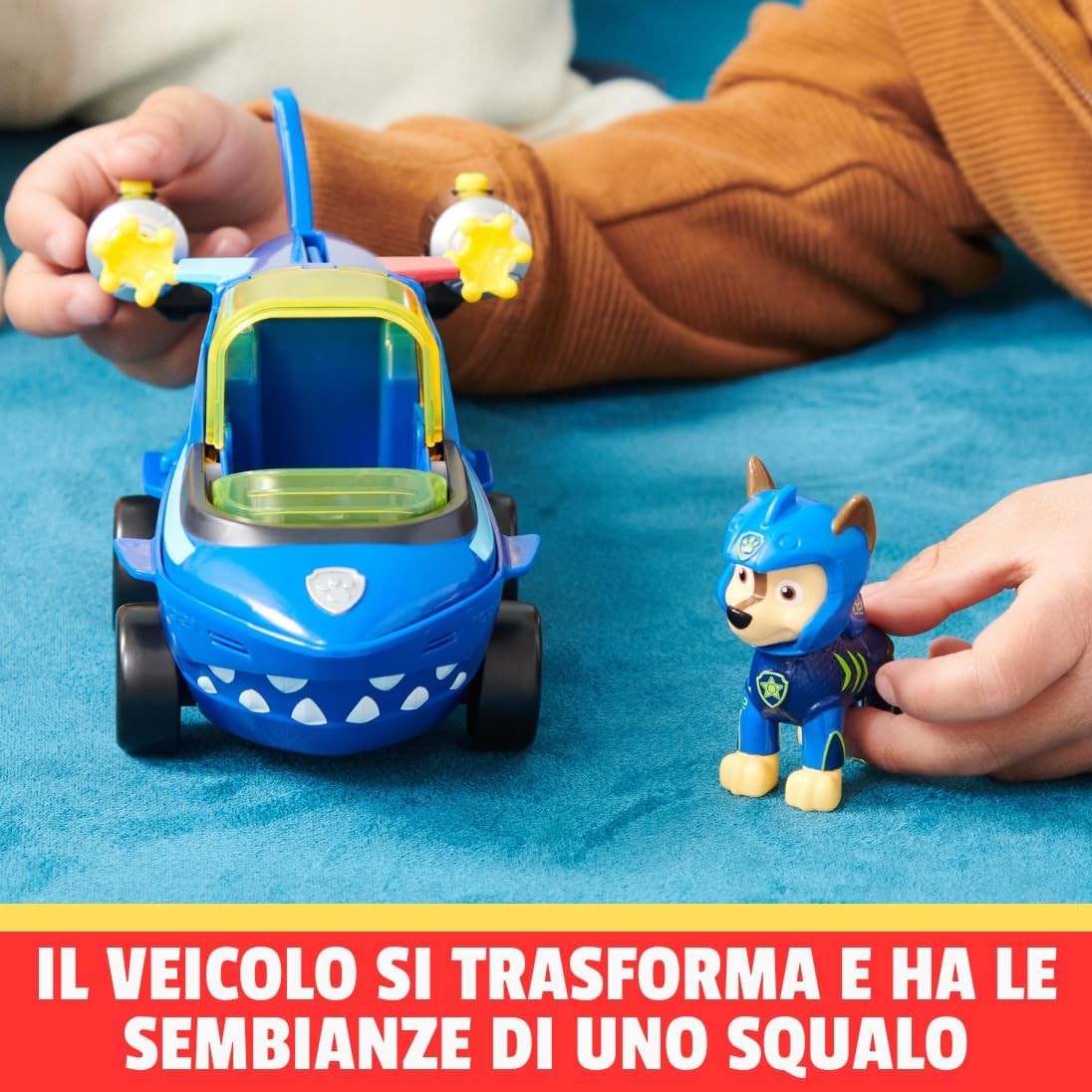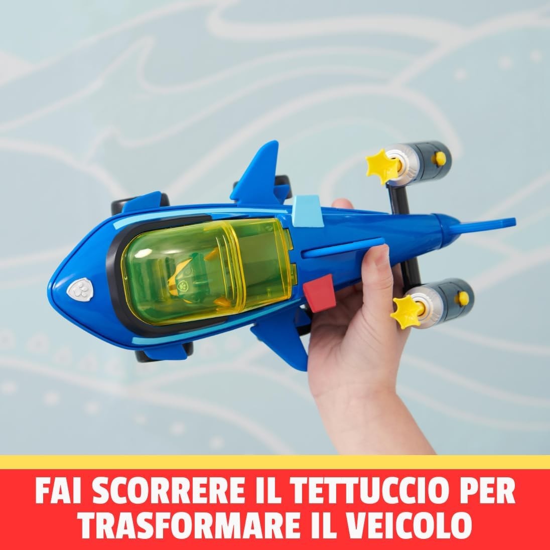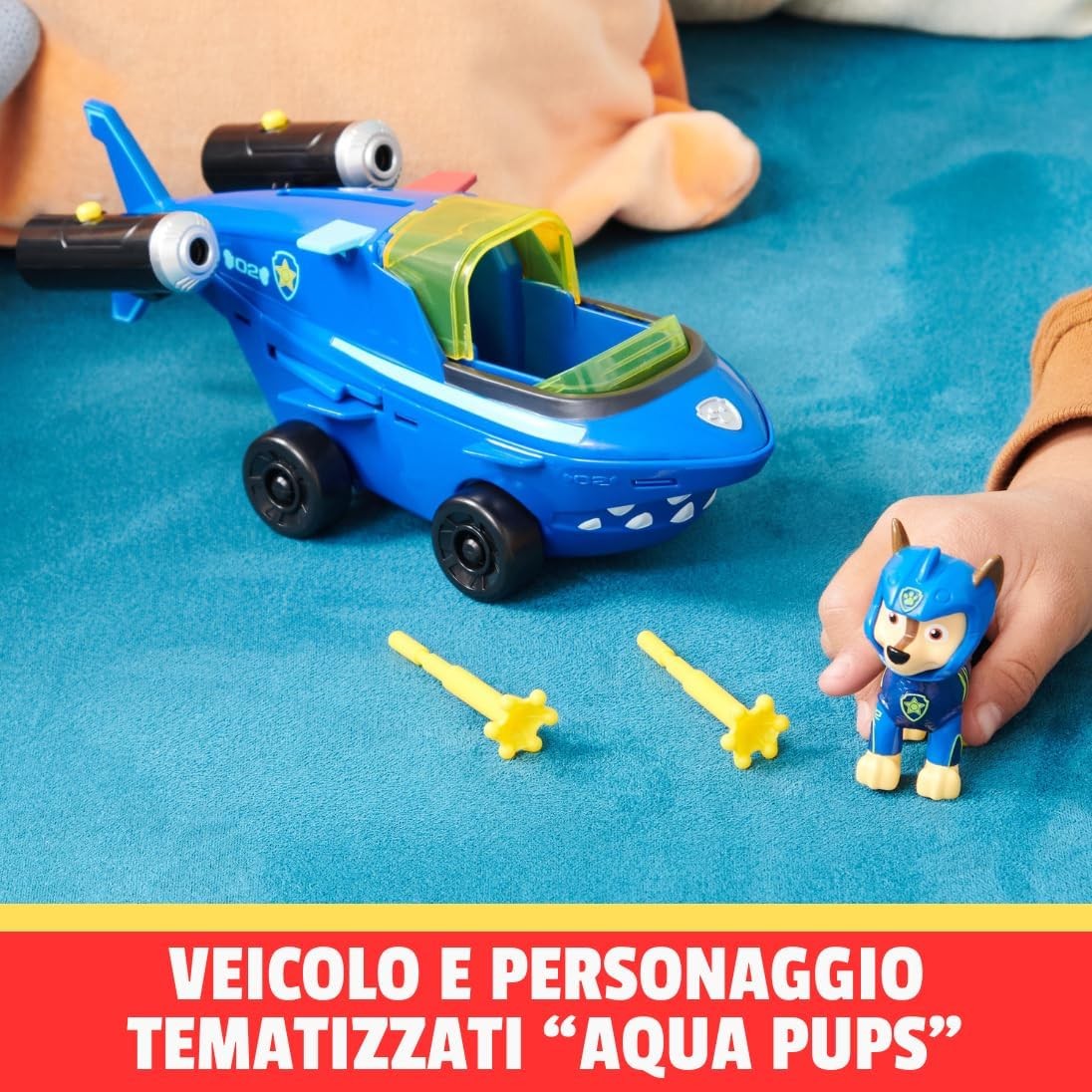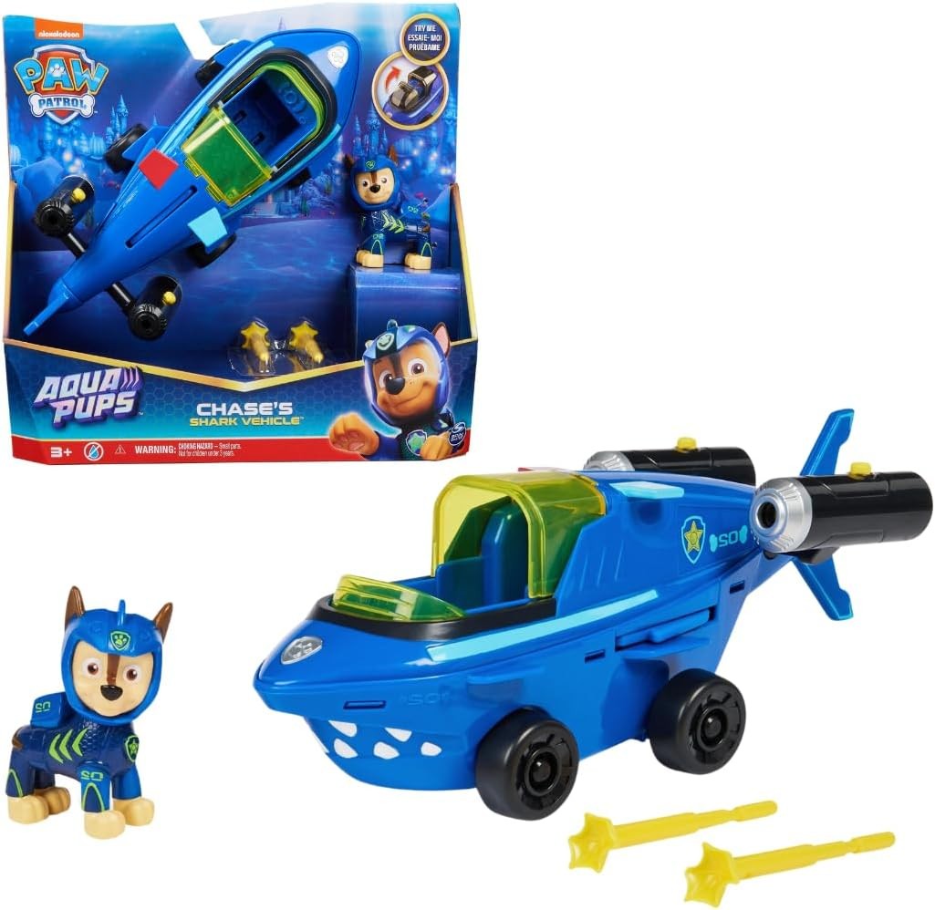 Scopri il veicolo trasformabile Aqua Pups di Chase di Paw Patrol! Questo veicolo a forma di squalo è progettato con dettagli realistici e include il personaggio di Chase in uniforme originale, pronto per le avventure marine. Inserisci Chase nella cabina di pilotaggio, chiudi il tettuccio e trasforma il veicolo per l'azione. Carica i proiettili nei propulsori e premi i pulsanti per lanciare e risolvere le situazioni di salvataggio. Non richiede pile e offre ore di divertimento. Espandi la tua collezione Paw Patrol collezionando tutti i veicoli a tema Aqua Pups e preparati per emozionanti avventure marine!
