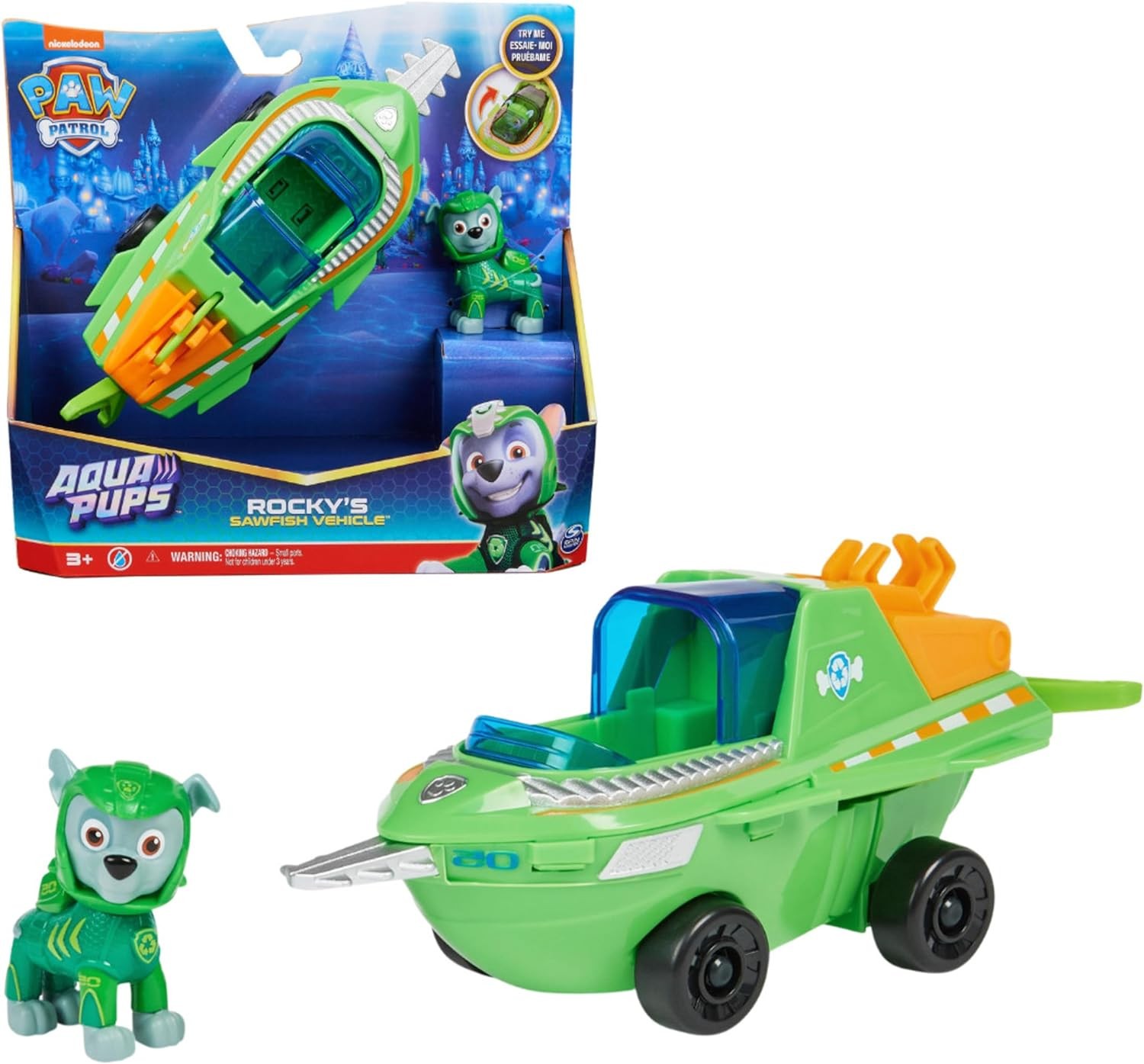 Paw Patrol Aqua Pups, veicolo trasformabile di Rocky, personaggio Rocky incluso, giocattolo per bambini 3+ anni