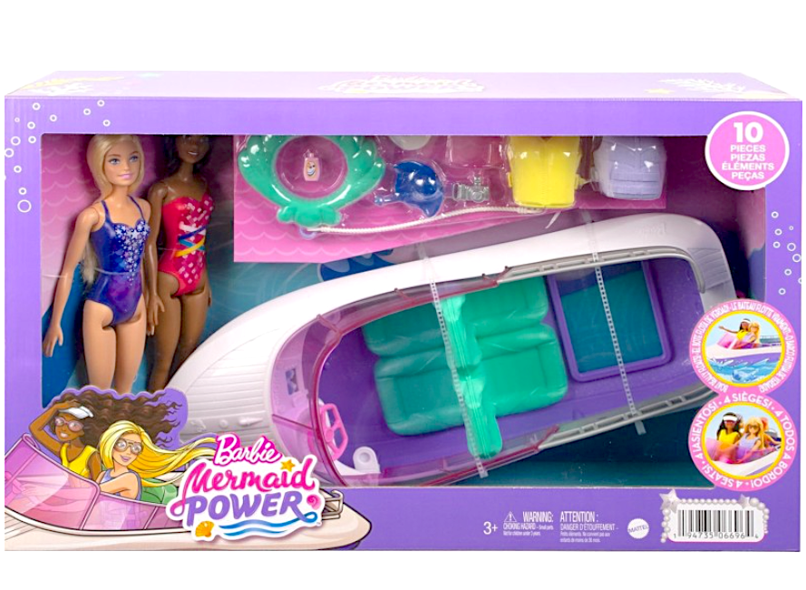 Scopri l’universo magico di Barbie Mermaid Power con il playset HJK58, che include due bambole iconiche, Malibu e Brooklyn, e una barca capiente che può accogliere fino a quattro bambole.