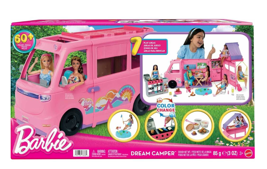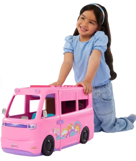 Regala un’esperienza ricca di fantasia con il Barbie Camper dei Sogni, un playset completo firmato Mattel con ben 7 aree di gioco e oltre 60 accessori. Apri il camper rosa per scoprire una tenda sul tetto che ospita due bambole, un salottino, una zona pranzo, un bagno e molto altro.
