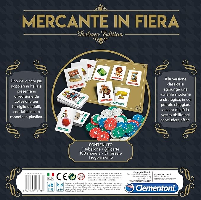Clementoni Mercante in Fiera Deluxe Edition è una versione arricchita di un grande classico dei giochi da tavolo, perfetto per adulti e bambini dai 8 anni in su. Questa edizione speciale include fiches in plastica, un tabellone e una variante di gioco innovativa che rende ogni partita unica e coinvolgente. Le 40 carte illustrate, con immagini dai colori vivaci, catturano l'attenzione e rendono il gioco ancora più appassionante. Che tu stia cercando un modo per trascorrere del tempo di qualità con la famiglia o un'attività divertente per una serata con amici, questo gioco da tavolo è la scelta ideale. Realizzato e progettato in Italia, il Mercante in Fiera Deluxe Edition garantisce ore di divertimento e intrattenimento per tutti.