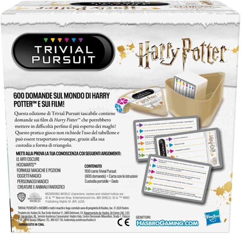 Questo gioco Trivial Pursuit Harry Potter è progettato per essere compatto e portatile, senza un tabellone fisico, ma con tutto il necessario all'interno di una pratica confezione a forma di triangolino. È un'ottima scelta per le famiglie e gli appassionati di Harry Potter che desiderano testare le proprie conoscenze con 600 domande basate sui momenti più memorabili dei film. Adatto per giocatori da 8 anni in su, è il regalo perfetto per un divertimento magico in ogni occasione!