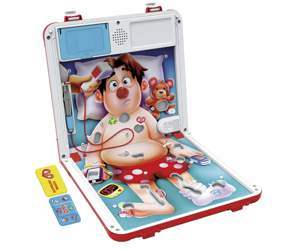 Il paziente Dario, con un design rinnovato e cavità nuove – tra cui una a forma di ghirigoro – rende ogni operazione più creativa e divertente. I suoni buffi come starnuti e “bzzt!” insieme al naso luminoso che si accende al minimo errore aumentano l’interazione sensoriale, rendendo il gioco ancora più immersivo.
