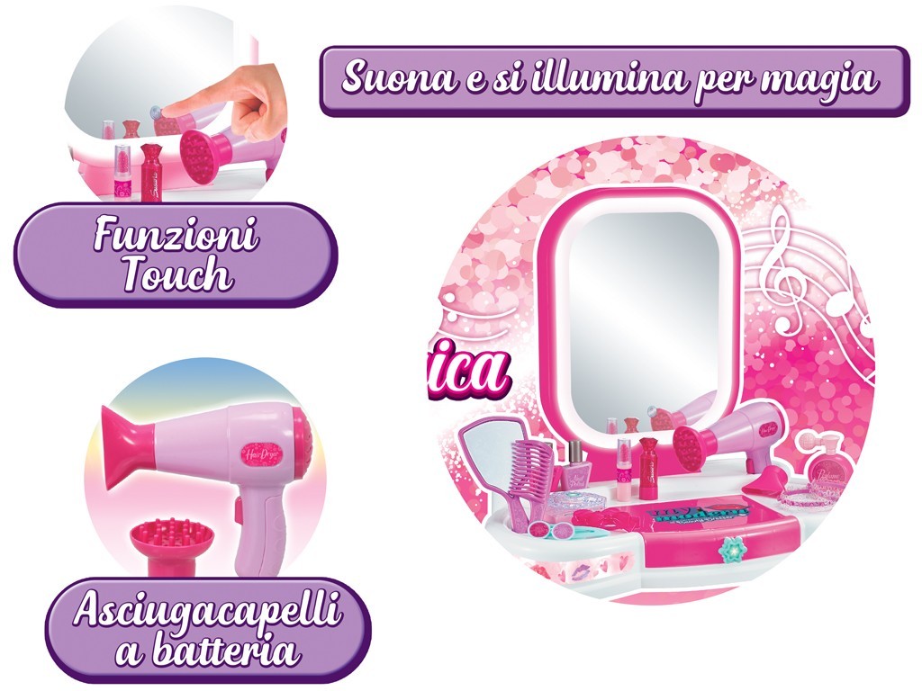 Miss Signorina Specchiera è un gioco interattivo alta 72 cm, completa di LED, luci e suoni per rendere il gioco più realistico e divertente. Ideale per bambine che amano il make-up e i giochi di dress-up, stimola la creatività e il gioco di ruolo in totale sicurezza. Un regalo perfetto per momenti di gioco originali e coinvolgenti.