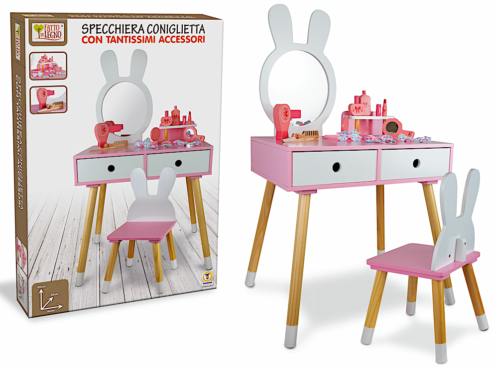 SPECCHIERA CONIGLIETTA IN LEGNO, TAVOLINO E SEDIA PER BAMBINI, 3+ ANNI, GIOCO EDUCATIVO, FATTO DI LEGNO - GIOCO EDUCATIVO