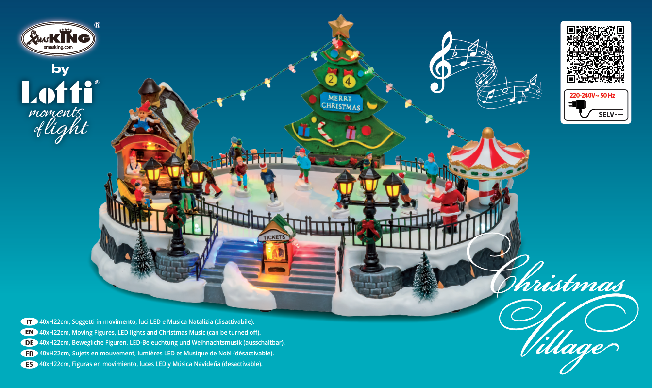 Porta il fascino del Natale nella tua casa con il Villaggio Luna Park con Lago Ghiacciato e Pattinatori in Movimento. Questa meravigliosa decorazione in polyresina cattura l'essenza delle festività con un lago ghiacciato in cui i pattinatori si muovono elegantemente, circondati da un incantevole luna park innevato. Le luci LED colorate aggiungono un tocco speciale, creando giochi di luce che illuminano l'intera scena.Grazie all'interruttore a tre posizioni, puoi goderti l'intera esperienza con luci, movimento e musica, o scegliere di mantenere solo l'illuminazione e i pattinatori in movimento. Perfetto per decorazioni interne, viene fornito con trasformatore incluso e ha dimensioni di 40x27xH22cm, perfette per essere esposto su mensole o tavolini, rendendo ogni angolo della tua casa più magico durante le festività natalizie.
