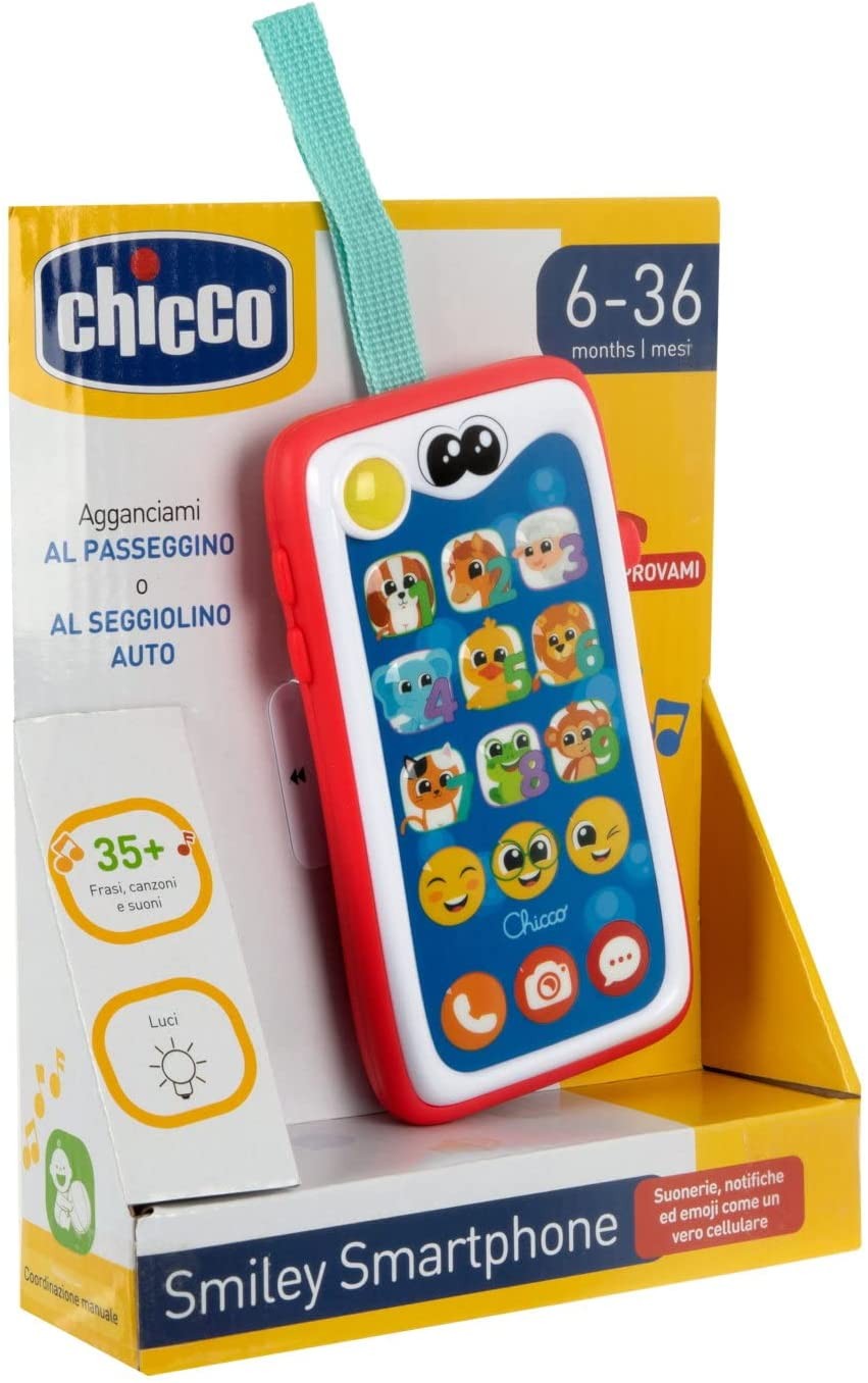 • Smartphone Giocattolo: Smiley Smartphone di Chicco è progettato per i più piccoli con grandi tasti in rilievo per attivare luci, suoni e prime parole.