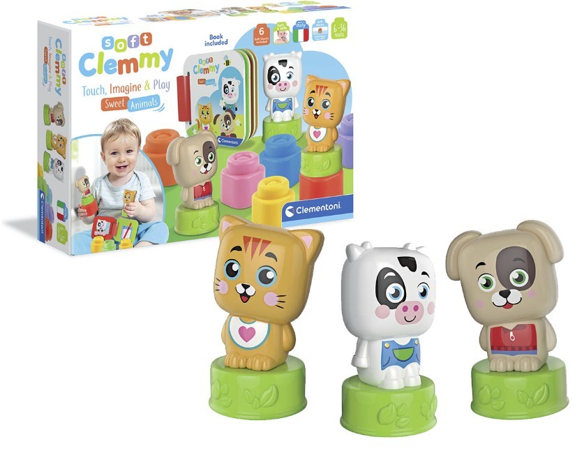 Il Clemmy Sweet Animals Book Playset è un gioco creativo e educativo che stimola la fantasia e il linguaggio dei bambini. Questo set a tema animali include 6 mattoncini morbidi e tre simpatici personaggi, oltre a un libricino di cartone illustrato. Il bambino potrà inventare storie e interagire con i personaggi, stimolando così la fantasia, l'emotività e lo sviluppo linguistico. I morbidi mattoncini Clemmy, facili da maneggiare e sicuri, sono ideali per sviluppare la manualità e la percezione sensoriale. I personaggi e i mattoncini sono lavabili in acqua tiepida con detergente neutro, per garantire un gioco sempre pulito e sicuro. Tutto è realizzato in Italia, con materiali atossici, per garantire alta qualità e sicurezza.