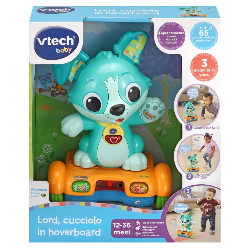 Baby Lord Cucciolo in Hoverboard è un giocattolo interattivo che combina il divertimento del gioco attivo con la tecnologia. Lord, un cagnolino dispettoso, invita il bambino a seguirlo mentre scappa su un hoverboard con tre ruote, muovendosi avanti, indietro e girando. Equipaggiato con quattro sensori, Lord evita gli ostacoli e sa quando il bambino si avvicina, scappando dalla parte opposta. Il giocattolo include quattro pulsanti interattivi per scoprire numeri, emozioni e musica, e offre 15 melodie e 3 canzoni per un intrattenimento continuo.