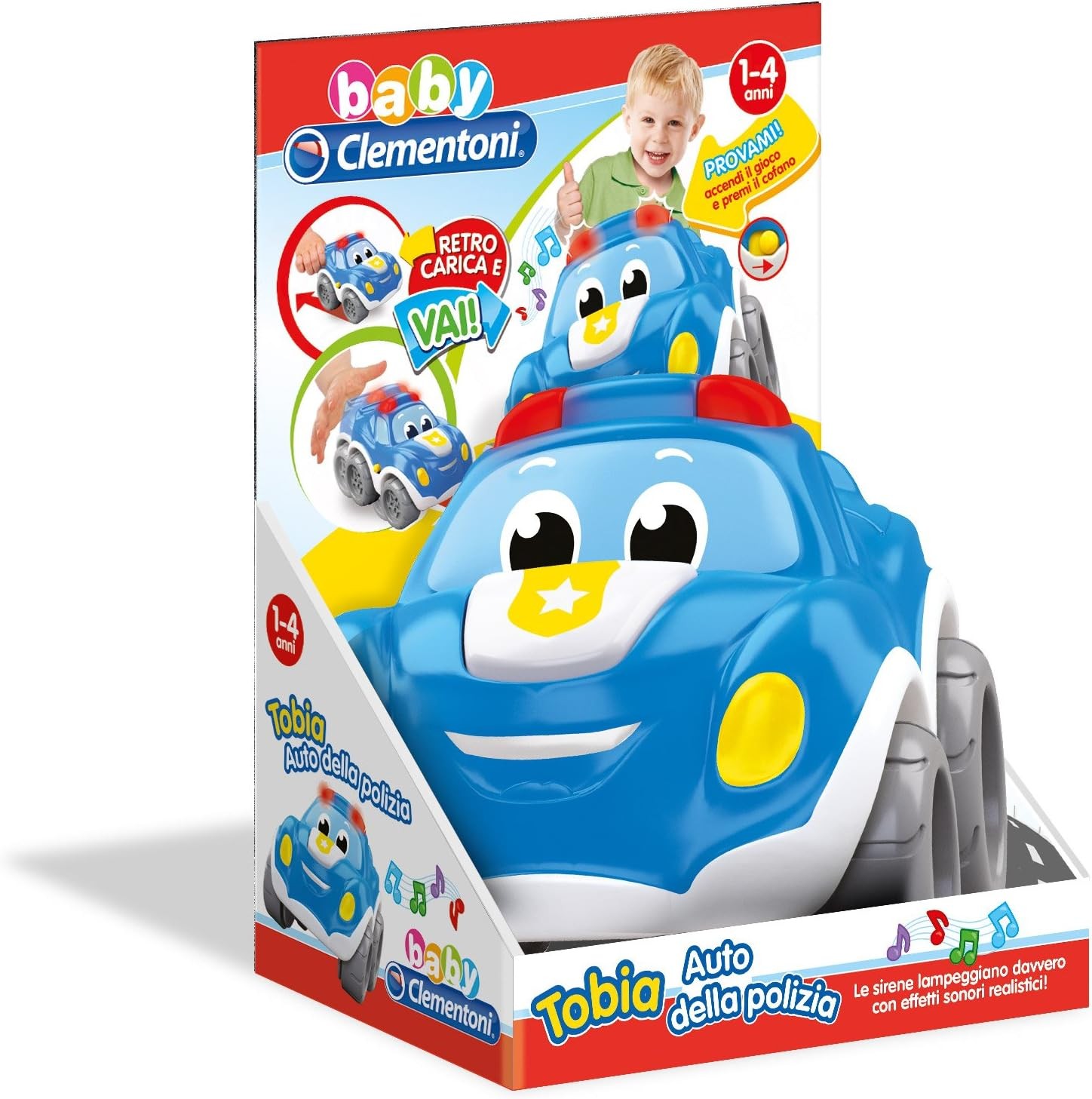 La Clementoni Tobia Auto della Polizia è una grintosa macchinina parlante e interattiva pensata per i più piccoli. Questo giocattolo educativo cattura l'attenzione dei bambini con una simpatica canzoncina e tante frasi divertenti. Grazie alla sua funzione di retrocarica, i bambini possono far sfrecciare l'auto avanti e indietro, rendendo il gioco ancora più entusiasmante. Il pulsante interattivo attiva suoni realistici, mentre la sirena lampeggiante imita una vera auto della polizia, offrendo un'esperienza di gioco coinvolgente. Tobia stimola la percezione visivo-uditiva, la manualità e la comprensione della relazione causa-effetto, contribuendo allo sviluppo cognitivo dei bambini. Questo gioco è ideale per intrattenere ed educare, offrendo ore di divertimento sicuro e stimolante.