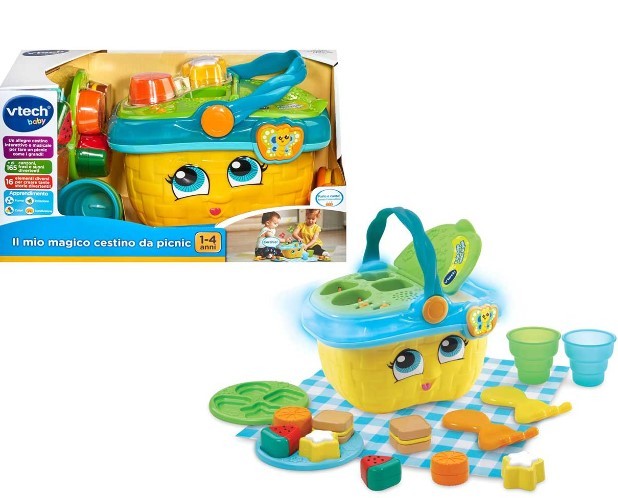 VTech Il Mio Magico Cestino da Picnic è un divertente gioco educativo pensato per bambini da 1 a 4 anni. Un cestino colorato ricco di attività interattive che aiutano i più piccoli a riconoscere forme, colori e oggetti attraverso il gioco. Grazie ai suoni, alle frasi in lingua italiana e agli accessori inclusi, i bambini possono vivere esperienze di gioco di ruolo coinvolgenti, sviluppando fantasia e abilità cognitive. Un compagno ideale per imparare divertendosi. Batterie incluse, pronto all’uso.