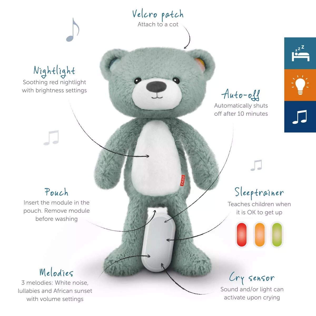 Brody, il tenero orsetto di Zazu, diventerà il nuovo compagno di sonno del tuo bambino. Oltre ad essere un morbido peluche, Brody è anche una lampada da notte e un trainer del sonno. All'interno dell'orsetto si trova una modulazione del suono che riproduce suoni calmanti come il rumore bianco, le ninne nanne e il suono del tramonto. La musica si spegne automaticamente dopo 20 minuti, ma si riattiva appena il bambino inizia a piangere. L'orsetto può essere utilizzato sia con che senza la modulazione del suono. Senza la parte elettronica, Brody è lavabile. Quando è il momento di dormire, l'orsetto illumina il suo pancino con una luce rossa rilassante, che non interferisce con la produzione di melatonina. Al mattino presto, la luce cambia da rossa a arancione, segnalando che non è ancora il momento di alzarsi. Quando arriva il momento giusto, il pancino di Brody diventa verde, indicando che è tempo di svegliarsi.
