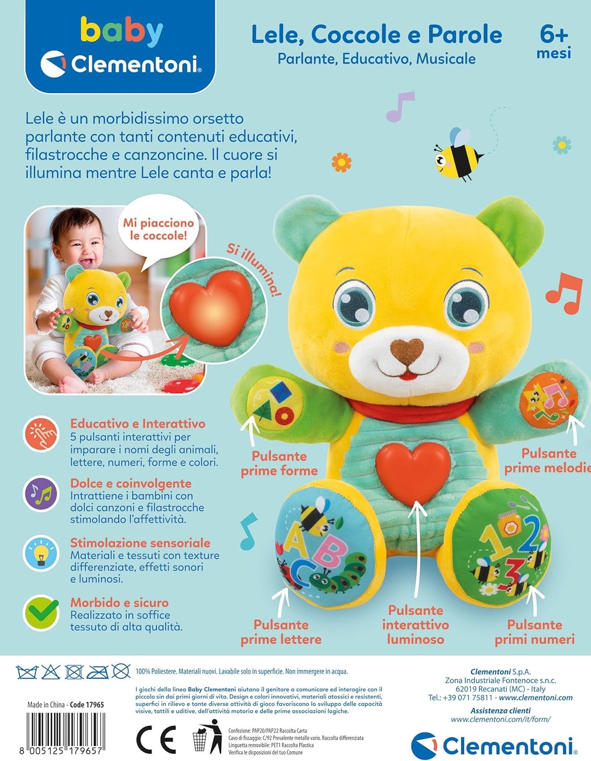 Lele Coccole e Parole è un tenerissimo peluche interattivo parlante ideato per accompagnare i più piccoli nei primi passi dell’apprendimento. Dotato di cuore luminoso e pulsanti sonori, stimola lo sviluppo sensoriale, linguistico e cognitivo con musiche, frasi ed effetti sonori dolci e coinvolgenti. Perfetto fin dai 6 mesi, è pensato per educare e rassicurare allo stesso tempo.