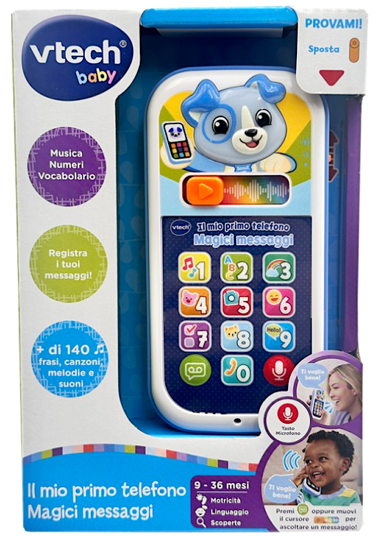 Il VTech Il Mio Primo Telefono - Magici Messaggi Blu è un divertente gioco educativo pensato per bambini dai 9 ai 36 mesi. Con i suoi 10 pulsanti luminosi, il bambino può imparare numeri e lettere in modo semplice e stimolante, imitando gli adulti mentre usa il telefono. Suoni, frasi e melodie in lingua italiana accompagnano l’apprendimento, favorendo lo sviluppo del linguaggio, della memoria e della coordinazione. Un compagno di gioco allegro e colorato, perfetto per le prime esperienze di apprendimento. Batterie incluse.