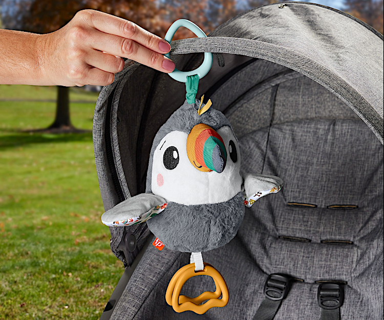 Il Tucano Vola con Me di Fisher-Price (modello HNX66) è un dolce compagno sensoriale pensato per intrattenere e stimolare i neonati sin dai primi mesi. Realizzato in morbidi tessuti, questo peluche ha ali fruscianti che si muovono, suoni clac clac e colori vivaci per coinvolgere vista, tatto e udito del bambino.