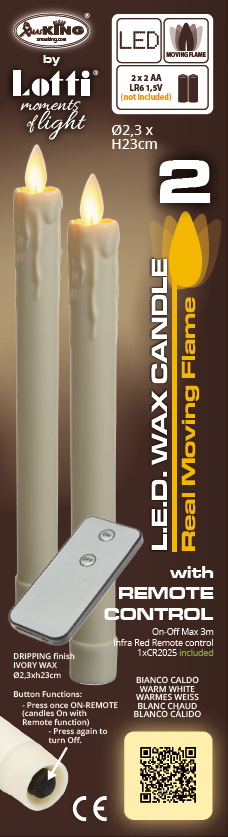Le candele sono dotate di un telecomando IR che permette di controllare l'accensione e lo spegnimento fino a 3 metri di distanza, offrendo massima comodità. Funzionano con 2 batterie AA per ciascuna candela, garantendo un uso sicuro e senza fiamme reali, perfette per essere utilizzate in ambienti interni (certificazione IP20).