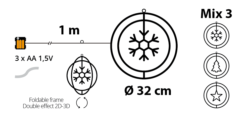 Il sistema include un Timer giornaliero 8h On (16h Off), attivabile o disattivabile tramite pulsante a 3 funzioni (Timer – On – Off) integrato nel porta batterie IP44. Il funzionamento avviene con 3 batterie AA da 1,5V (non incluse), che rendono la decorazione portatile e facilmente collocabile ovunque.