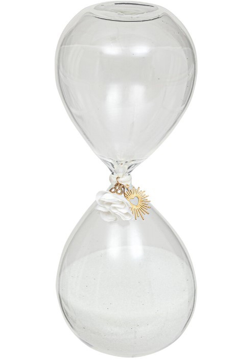 La clessidra in vetro Floral di Atmosphera è un elegante oggetto decorativo che unisce poesia e funzionalità. Alta 20 cm, è realizzata in vetro trasparente e contiene sabbia sufficiente per un timer di 30 minuti. Il centro è ornato con una maglia decorativa che racchiude piccoli dettagli dorati, perfetti per aggiungere un tocco raffinato e romantico a qualsiasi ambiente della casa. Ideale per la cucina, il soggiorno o come elemento di arredo su mensole e ripiani.