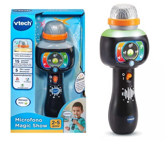 VTech Microfono Magic Show è il microfono karaoke ideale per bambini dai 2 ai 5 anni. Include 15 canzoni e 5 filtri vocali divertenti per trasformare ogni performance in uno spettacolo unico. Grazie al Bluetooth, i piccoli possono collegare dispositivi esterni e cantare le loro canzoni preferite. La regolazione del volume e il design sicuro rendono il gioco divertente e adatto ai più piccoli. Completamente in lingua italiana e pronto all’uso grazie alle batterie incluse, stimola la creatività, il senso del ritmo e l’amore per la musica.