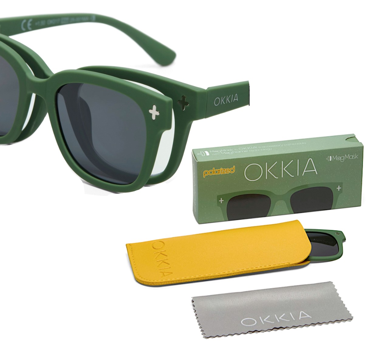 Il MagMask Clip-on Giovanni - Verde è la soluzione ideale per trasformare rapidamente i tuoi occhiali OKKIA con tecnologia MagFrame in occhiali da sole eleganti e protettivi.