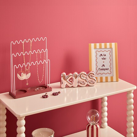 La decorazione parola "Chéri" è realizzata in dolomite, un materiale ceramico resistente e leggero, dalle dimensioni di 21,5 cm di larghezza, 4 cm di profondità e 8,5 cm di altezza. Disponibile in due assortimenti di colori assortiti tra KISS, Light Pink WOW e Dark Pink, questa decorazione è perfetta per aggiungere un tocco romantico e vivace agli ambienti domestici. Ideale per essere posizionata su mensole o scaffali, fa parte della collezione Chérie Cherry con ciclo di vita ACTUA, unendo stile e durabilità.