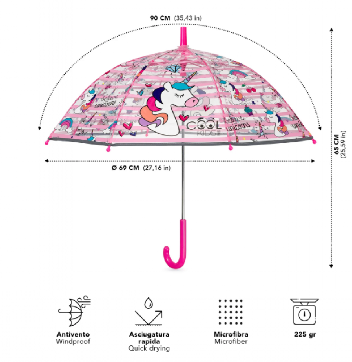 L’ombrello manuale da 45 cm con cupola “Poe Unicorno” è perfetto per i bambini che amano un tocco di magia anche nei giorni di pioggia. Facile da aprire e maneggiare, offre una protezione efficace grazie alla sua dimensione compatta e alla struttura resistente. Il design a tema unicorno è vivace e colorato, rendendo ogni giornata grigia più allegra e divertente. Ideale per la scuola o per l’uso quotidiano, è un accessorio pratico e simpatico per i più piccoli.