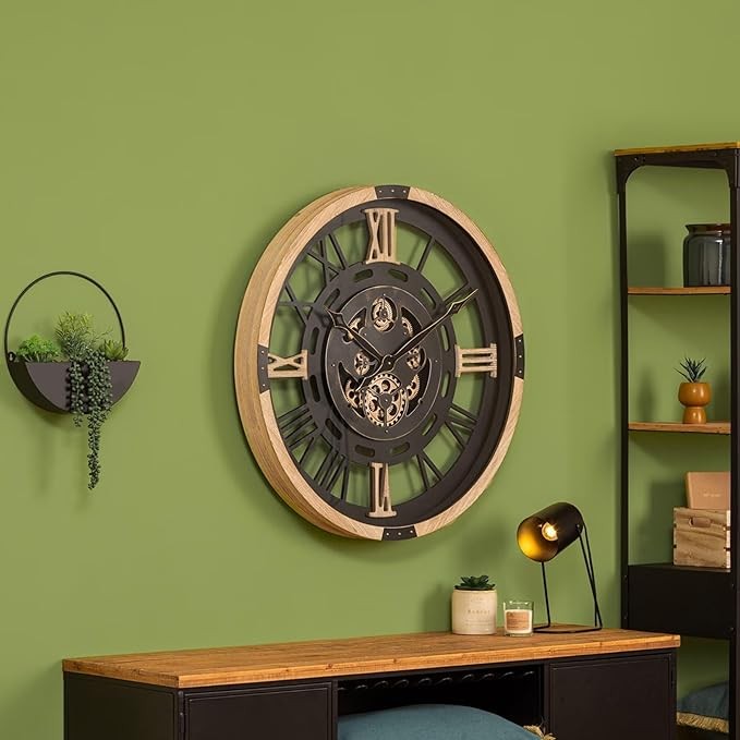 L'Orologio da Parete Atmosphera D80cm è un pezzo unico che unisce design industriale e funzionalità. Realizzato in metallo nero e legno naturale, è impreziosito da dettagli a ingranaggi visibili e numeri romani che conferiscono un fascino senza tempo. Il suo ampio diametro di 80 cm lo rende un elemento decorativo di grande impatto, ideale per salotti, uffici o ambienti in stile loft. Questo orologio non è solo un pratico strumento per misurare il tempo, ma anche un’opera d’arte per il tuo spazio.