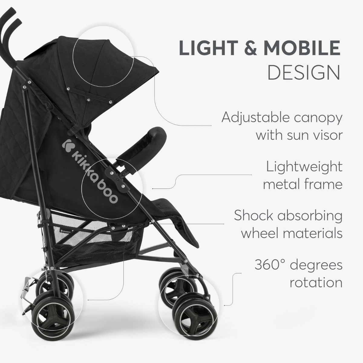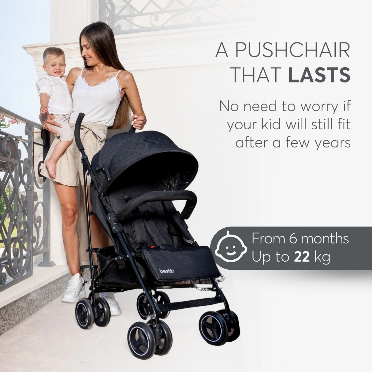 Il passeggino Beetle Grey è la scelta perfetta per le famiglie dinamiche che cercano praticità, sicurezza e comfort nei loro spostamenti quotidiani. Adatto per bambini dai 6 mesi fino a 22 kg, è dotato di un telaio in acciaio leggero ma resistente e di un sistema di chiusura a ombrello rapido e semplice. Le doppie ruote da 6 pollici, con rotazione a 360° delle anteriori, assicurano manovrabilità anche negli spazi più affollati. Il design compatto, una volta chiuso, è provvisto di blocco di sicurezza per il trasporto. Comfort garantito grazie alla capottina removibile con finestra in rete, schienale e poggiapiedi regolabili in 3 posizioni. Completano il passeggino una tasca posteriore per piccoli oggetti, maniglie ergonomiche e freno posteriore a pedale per fermate rapide. Perfetto per la vita urbana.