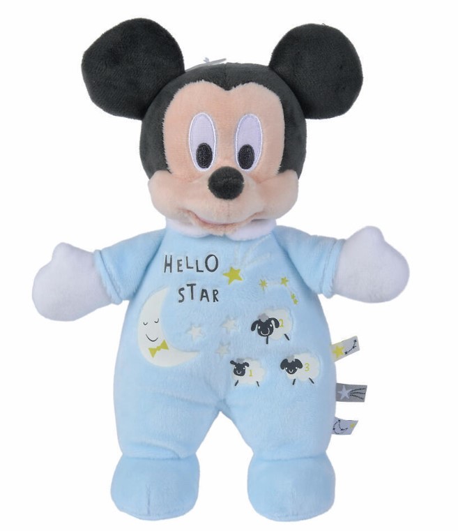 - Il Topolino alto 25 cm indossa un pagliaccetto azzurro su cui sono raffigurate una luna, stelle, tre pecorelle e la scritta "Hello Star"