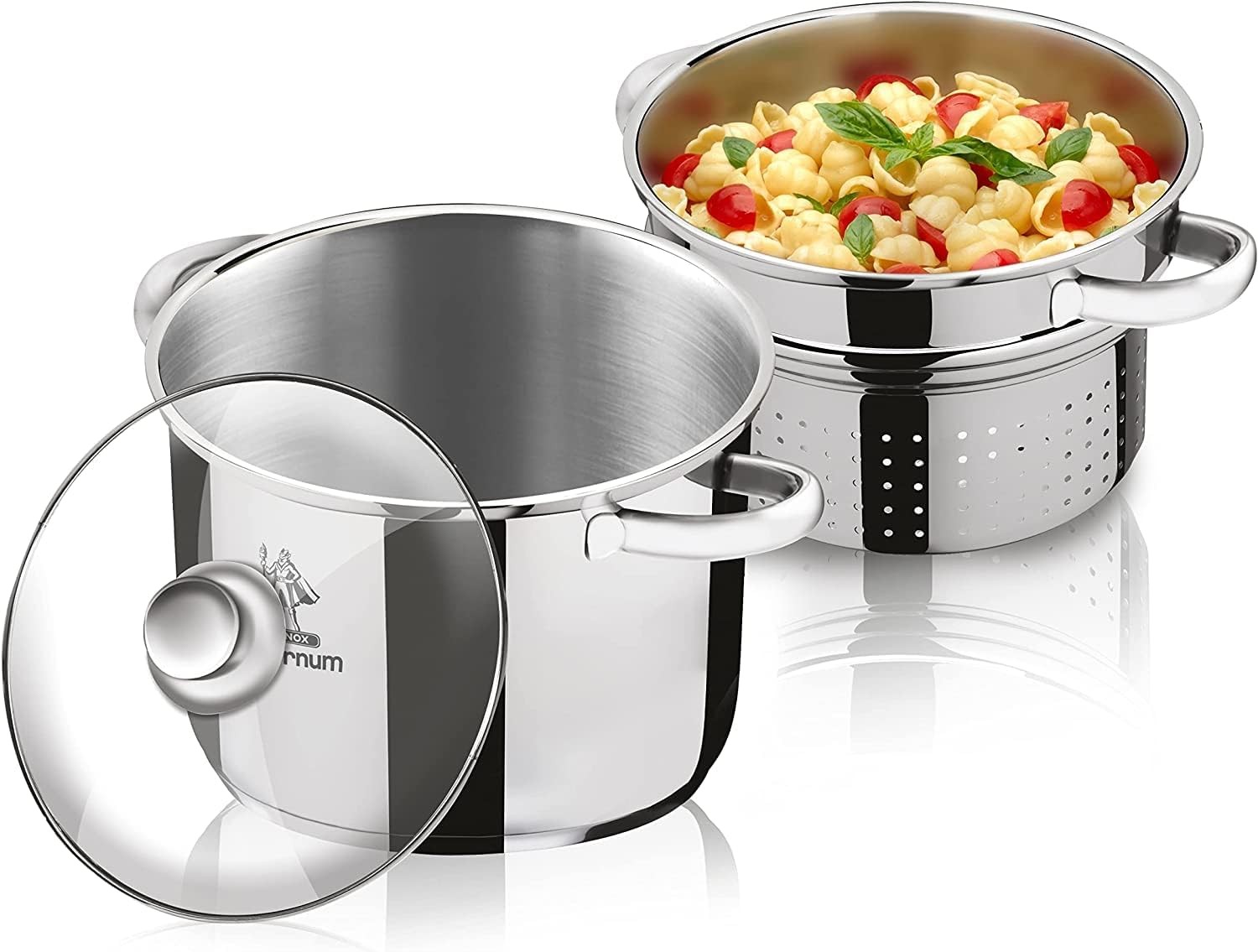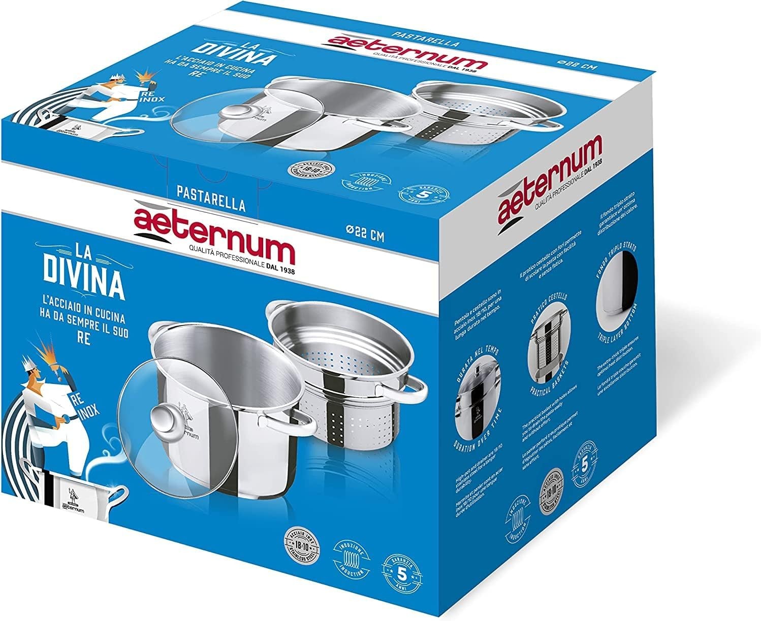 La pentola per pasta Aeternum Divina Pastarella, diametro 22 cm, combina praticità e qualità per la tua cucina. Realizzata in acciaio inossidabile 18/10 con triplo strato Acciaio/Alluminio/Acciaio, garantisce una distribuzione uniforme del calore. Maniglie in acciaio rivettato per una presa sicura. Adatta a tutti i piani cottura, inclusa l’induzione.