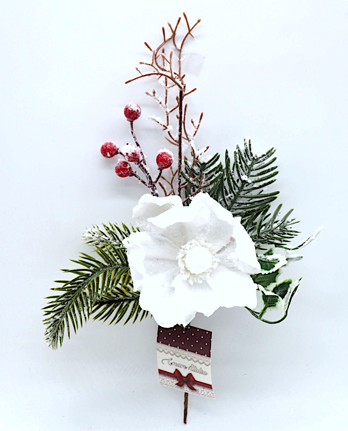 Il Pick innevato 32cm con aghi di pino, fiore e bacche natalizio è una decorazione elegante e naturale che arricchirà le tue composizioni festive.
