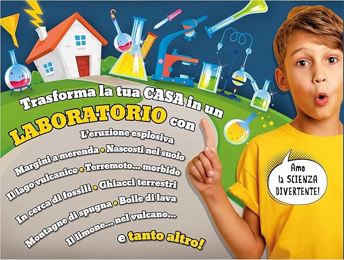 Il kit I'm a Genius Scienza in Casa Vulcanologia offre oltre 50 esperienze scientifiche entusiasmanti sulla scienza della Terra. Trasforma la tua casa in un laboratorio scientifico con un modellino di vulcano e un assortimento di materiali come amido di mais, pietre, sabbia magica e reagenti chimici. Include anche un charm lente d'ingrandimento, guanti e occhiali protettivi, carte per esperimenti e un manuale illustrato. Questo kit stimola l'apprendimento delle scienze fisiche e chimiche, incoraggiando la sperimentazione, l'osservazione e la creatività.