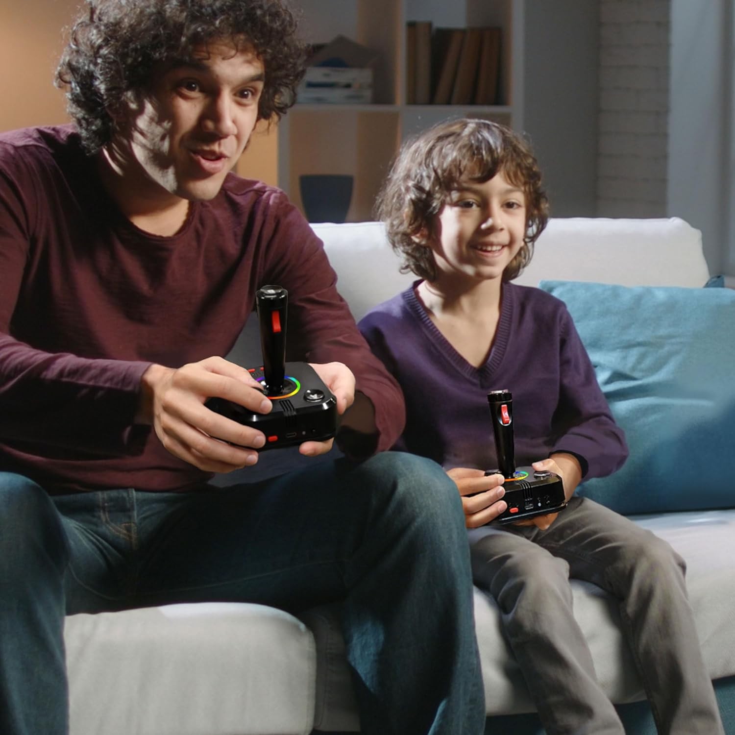- Due joystick wireless a 2,4 GHz, ispirati ai joystick originali Atari, includono paddle integrati per giochi come Breakout®, Warlords® e molti altri.