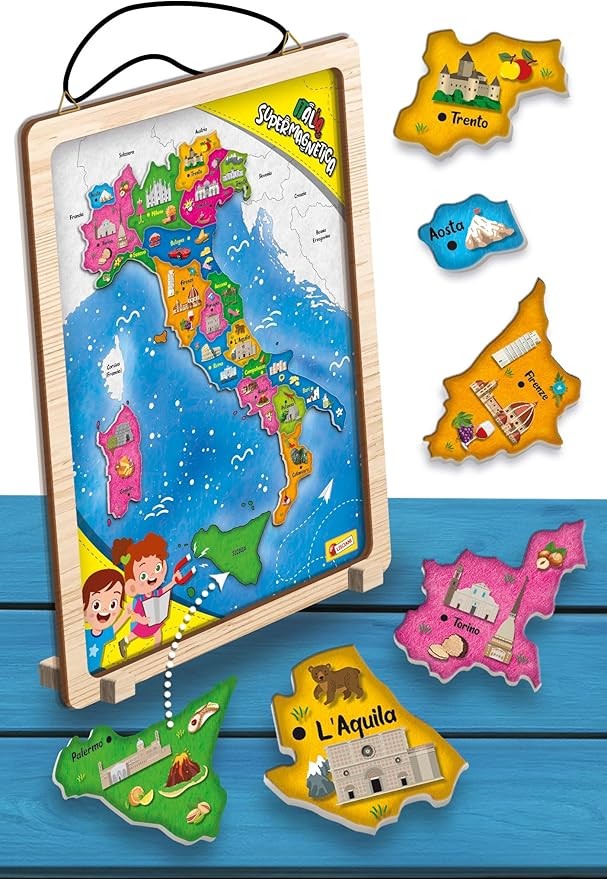 • "I'm a Genius Italia Supermagnetica" è il puzzle di legno ideale per bambini che vogliono esplorare e conoscere l'Italia. Con dimensioni di 30 x 40 cm, questo puzzle include regioni sagomate magnetiche che possono essere facilmente posizionate sulla mappa dell'Italia. Ogni regione offre l'opportunità di scoprire monumenti, curiosità, e aspetti della geografia, storia, flora, fauna, arte e tradizioni italiane. Le istruzioni incluse guidano i bambini attraverso il gioco, stimolando l'autonomia e il rispetto delle regole mentre si divertono e apprendono.