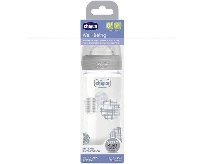 Chicco Biberon Glass 240ml Unisex con Tettarella in Silicone Flusso Lento