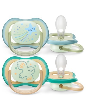 Il succhietto Ultra Air Nighttime Philips Avent, nei colori verde e bianco, è ideale per neonati da 0 a 6 mesi. Progettato con tettarella in silicone che imita la forma del seno materno, offre una sensazione di comfort e benessere. I fori extra-large permettono alla pelle di respirare, riducendo il rischio di irritazioni. Il pulsante con effetto fosforescente garantisce una visibilità notturna, facilitando il ritrovamento al buio. Include una pratica custodia per la sterilizzazione e la conservazione.