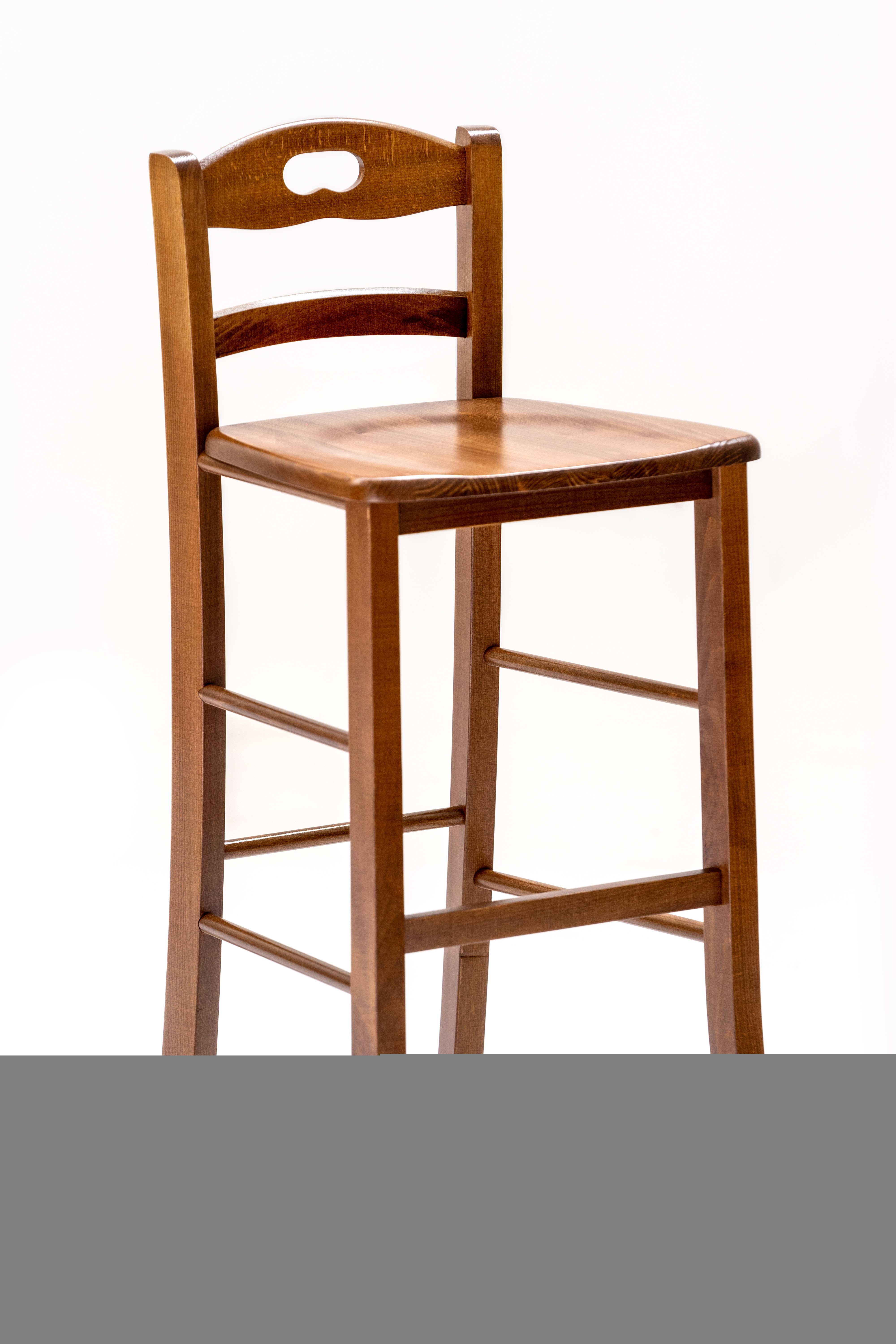 - 1. Sgabello Snack in legno massello di noce, altezza seduta 67 cm.